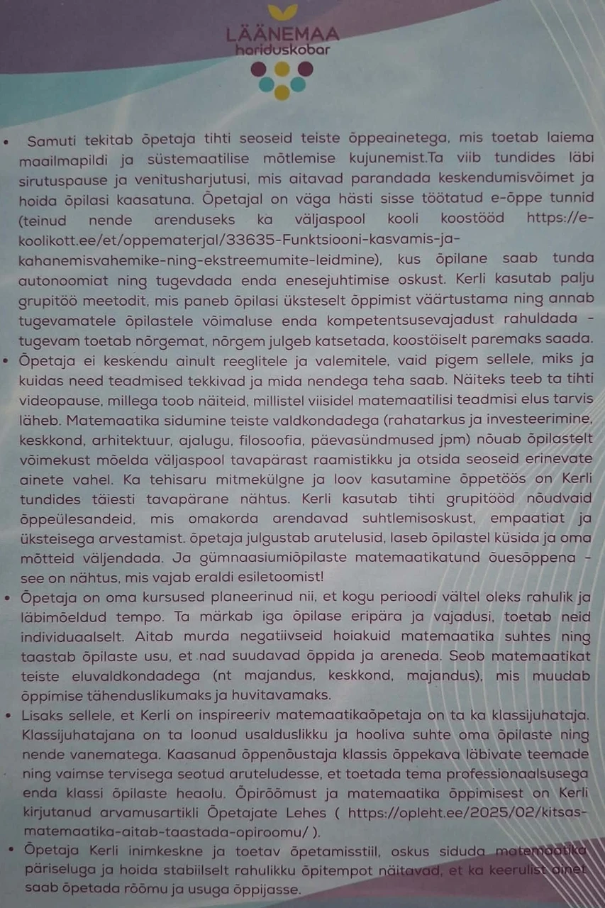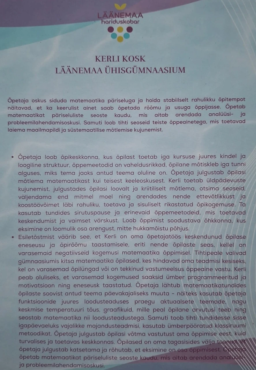 2024. aastal esitas Läänemaa Gümnaasiumi juhtkond mind Läänemaa ja riikliku Aasta gümnaasiumiõpetaja kandidaadiks. Läänemaal pälvisin laureaadi tiitli ning riiklikul tasandil olin finalist. Lisan siia kandideerimisavaldusel olnud teksti, sest tunnustuse keskmes oli minu järjepidev ja teadlik tegevus õppijate kaasamisel, nende arengu süsteemsel toetamisel ning turvalise, kaasava ja õppimist soodustava õpikeskkonna kujundamisel.